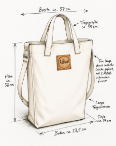 Mit einer Breite von ca. 37 cm, einer Höhe von ca. 38 cm und einer Tiefe von ca. 14 cm bietet die Tasche großzügigen Stauraum für die wichtigsten Alltagsbegleiter. Die Bodenbreite beträgt ca. 23,5 cm. Die kurzen Tragegriffe messen ca. 35 cm.